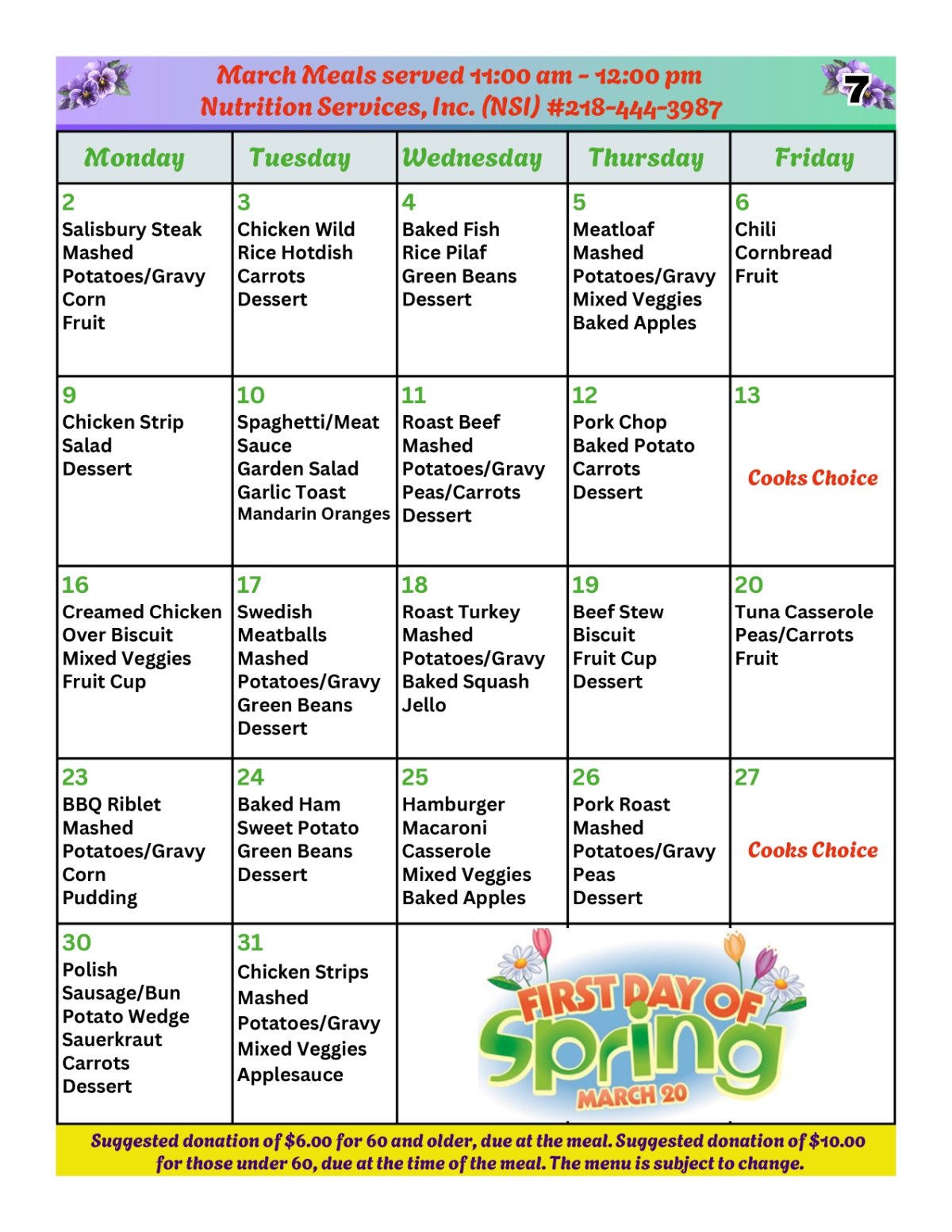 The suggested donation for those age 60 and over is $6.00. The cost for a meal if you are under 60 is only $10.00.