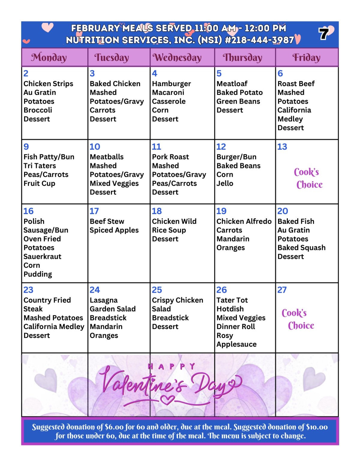 Nutrition Services Inc (NSI) offers Meals on Wheels and congregate dining in the Bemidji Senior Center dining room. The meals are nutritionally complete and delicious!